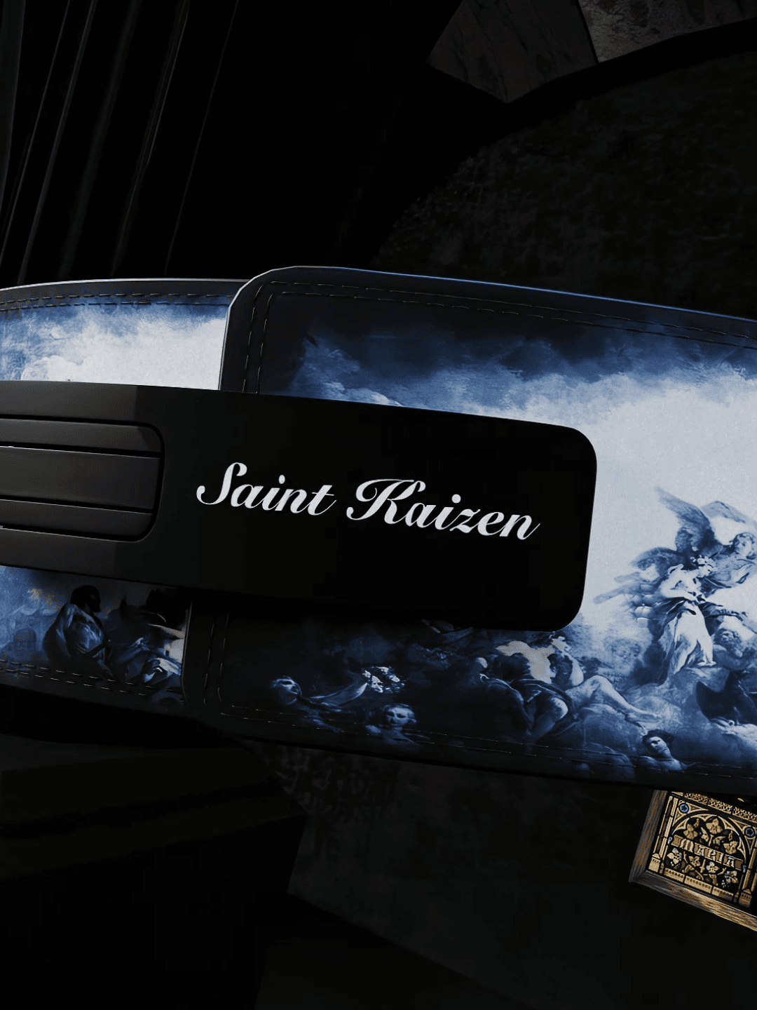 A cinematic CGI reveal for a gym lever belt inspired by ancient Christian mythology, drawing from themes of sacrifice, strength, and timeless authority—reframing the belt as a modern relic of power.